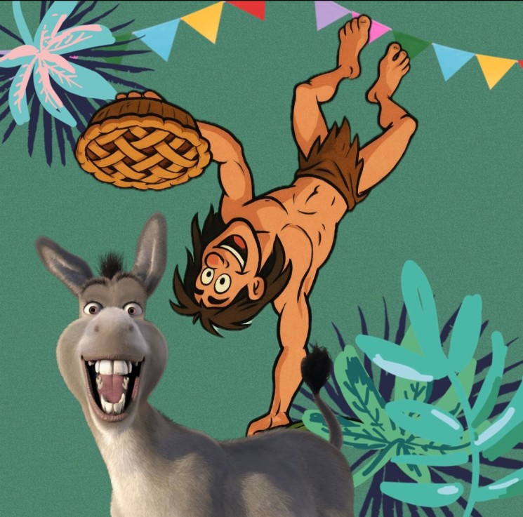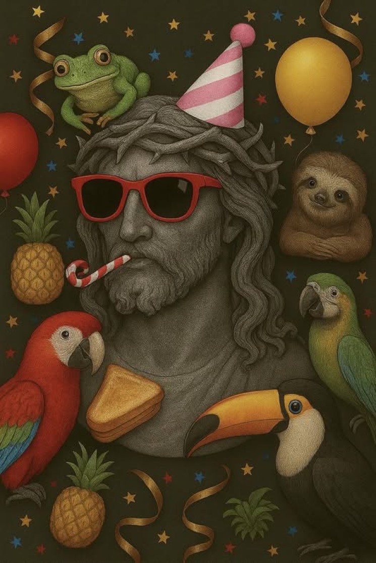 De laatste afbeelding hadden jullie de meeste hints uit kunnen halen. Het meest opvallende was de zilveren Jezus Christus. JC staat voor John & Corina, die dit jaar 25 jaar samen zijn: Een zilveren jubileum. De tropische sfeer die er rondom onze Jezus hangt verwijst naar het thema en de liefde van onze prins voor cocktails. Als laatste was er ook nog een verdwaalde tosti op de afbeelding te zien. Dit gaat over de vorige trouwe viervoeter van John, genaamd Tosti.
